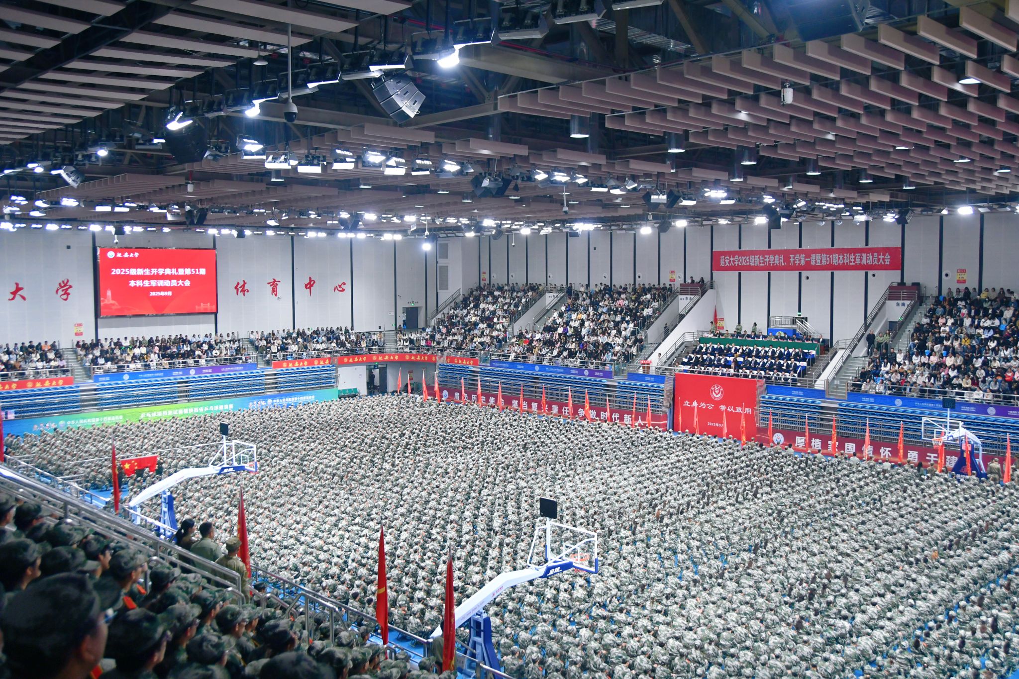 在雄壮的国歌声中,鲜艳的五星红旗缓缓升起,延安大学2025级新生开学典礼正式拉开帷幕。